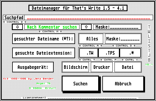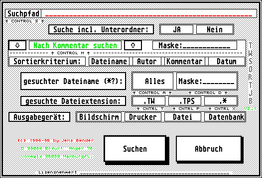TWLISTJB hilft bei der Suche nach von That's Write angelegten Textdateien (*.TW) anhand der Einträge in der TW-Datei-Info. Wer also die Zeilen Autor oder Betreff immer ausgefüllt hat, kann anhand dieser Daten die Datei suchen und von That's Write bis einschließlich Version 4 auch automatisch laden lassen (Accessory-Betrieb). | |